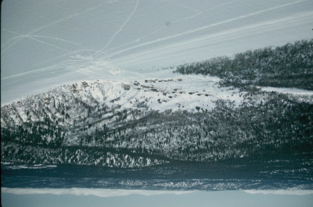We followed the Yukon river in general but made a few short cuts where the river curved off coarse Even though it was clear we didn’t see Russian Mission until we were right over it since it was hidden behind a hill and kind of tucked into a canyon that opened down to the river. The Stolfuses and half the eskimos in the village met us when we landed on the frozen river by the village.